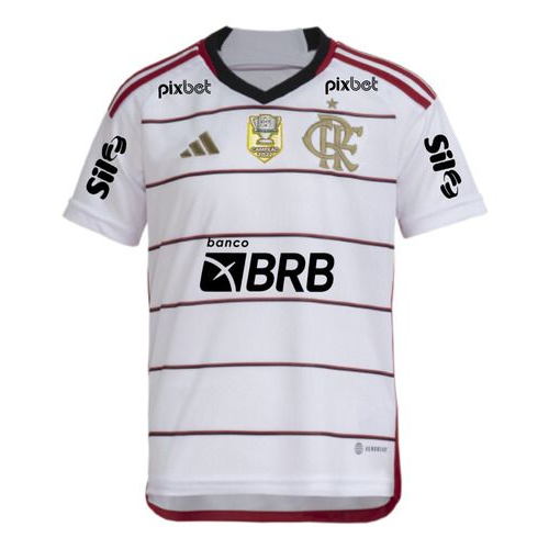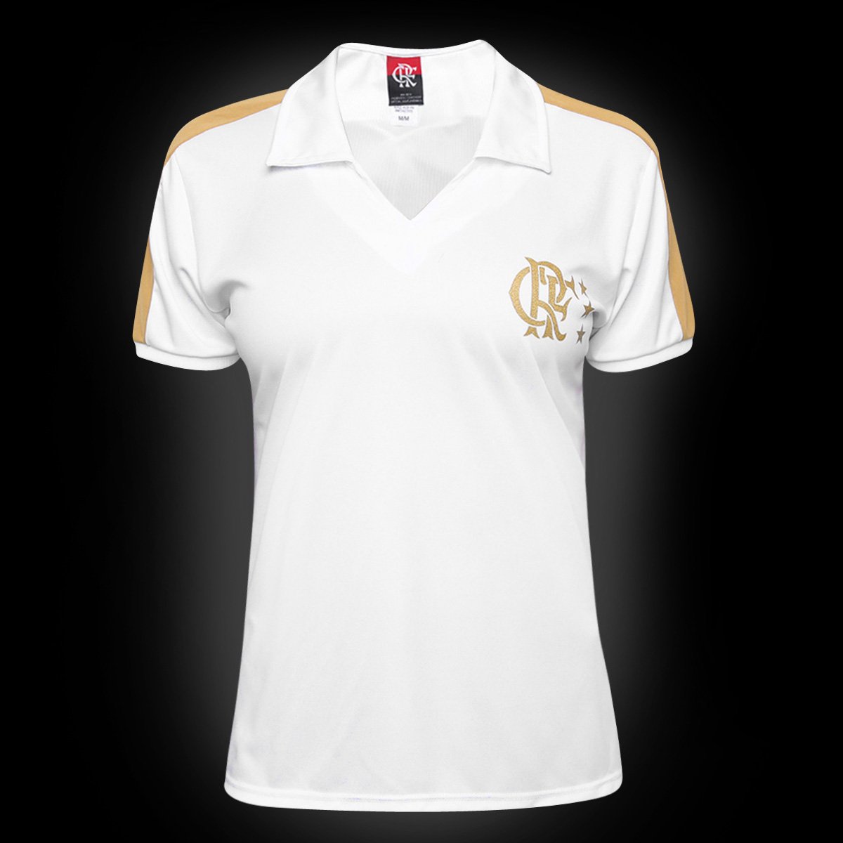 Camisa é predominantemente branca com listras fininhas horizontais nas cores vermelha e preta e escudo dourado. flamengo. TIMES. Série A. Série B. Europa Com toque dourado alusivo à "história campeã", Flamengo lança novo uniforme número 2; veja fotos. Thaís Regina foi uma das modelos para lançar a camisa 2 do Flamengo — Foto.