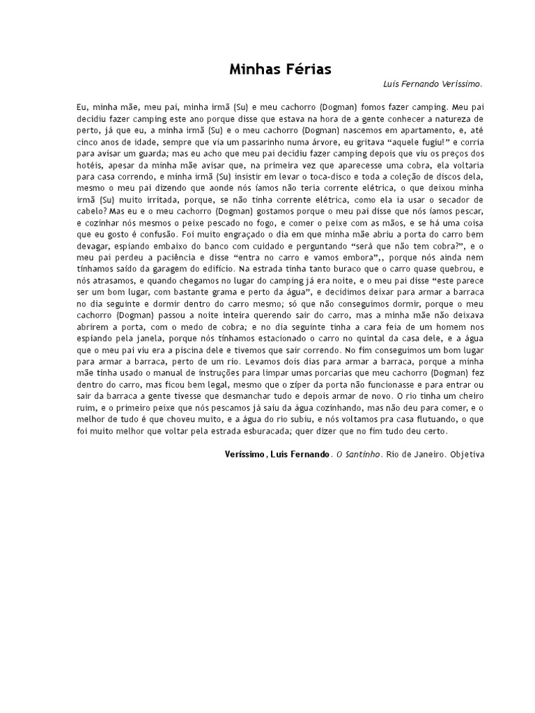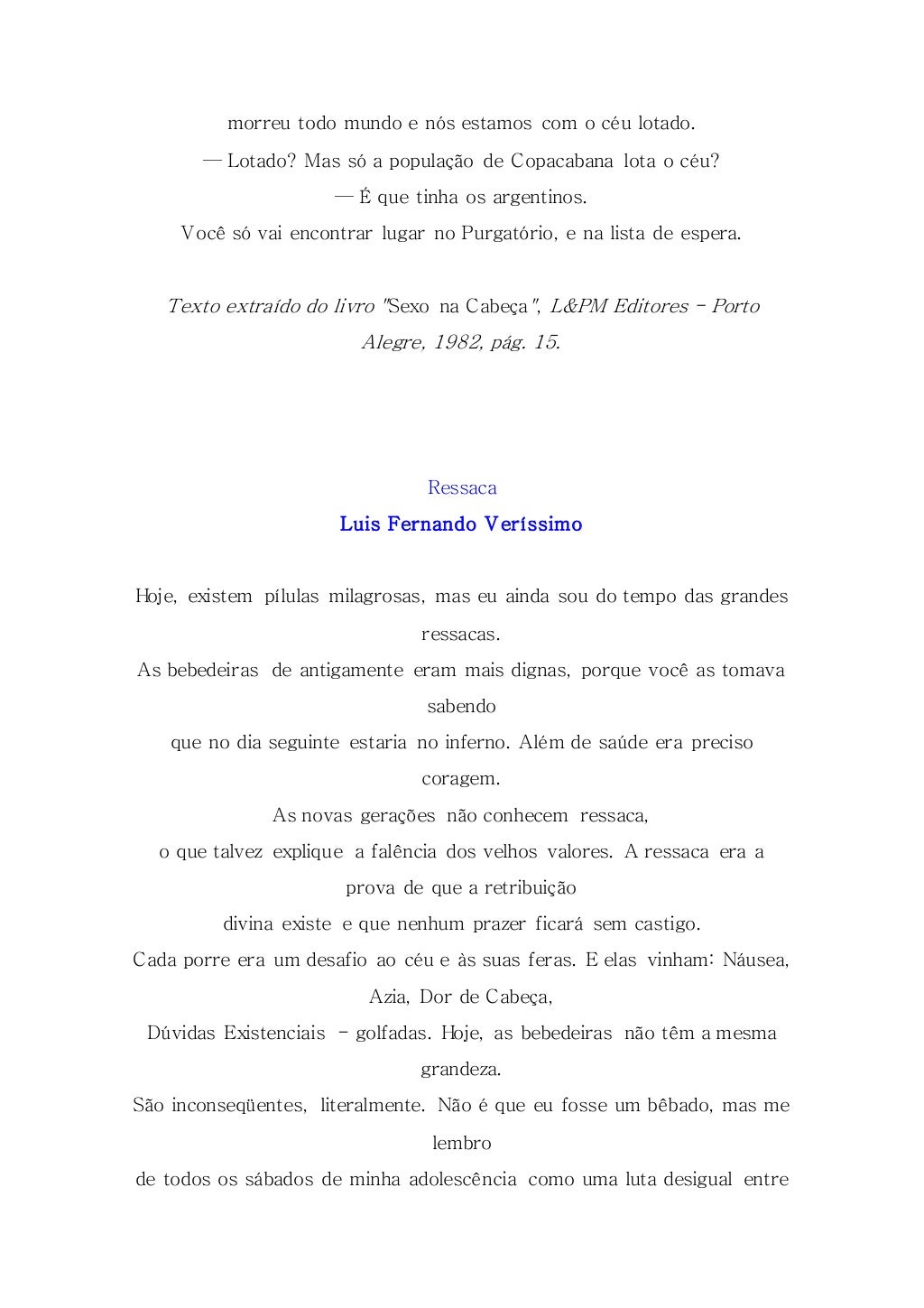 Crônica: A metamorfose, de Luis Fernando Veríssimo. Uma barata acordou um dia e viu que tinha se transformado num ser humano. Começou a mexer suas patas e viu que só tinha quatro, que eram grandes e pesadas e de articulação difícil. Não tinha mais antenas. Quis emitir um som de surpresa e sem querer deu um grunhido.
