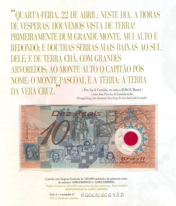 As cédulas de R$ 10 de plástico foram lançadas no dia 24 de abril do ano 2000 em comemoração aos 500 anos do descobrimento do Brasil. Ela foi desenhada para ter diversas referências à data comemorativa como uma imagem de Pedro Álvares Cabral, o mapa "Terra Brasilis", uma das primeiras representações da nova terra; um trecho da carta.