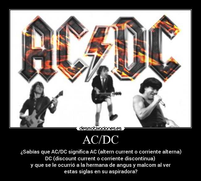 Te presentamos la historia que inspiró a la banda australiana para elegir el nombre que los llevaría a la cima del éxito. Existen muchas versiones sobre el significado de AC/DC, el nombre de la banda fundada en Sydney - Australia en 1973 por los hermanos escoceses Malcolm y Angus Young.Esta banda de 'hard rock' fue víctima de muchas acusaciones falsas por parte de los sectores más.