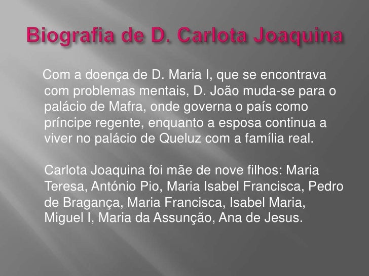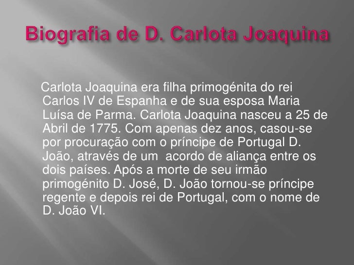 Juliana Bezerra. Professora de História. Adicionar aos favoritos. Dona Carlota Joaquina de Bourbón nasceu em 25 de abril de 1775, Infanta de Espanha, era filha do rei Dom Carlos IV e de sua esposa, a rainha Maria Luísa de Parma. Aprendeu idiomas, história, etiqueta da corte e religião. Possuía uma energia extraordinária e durante toda.