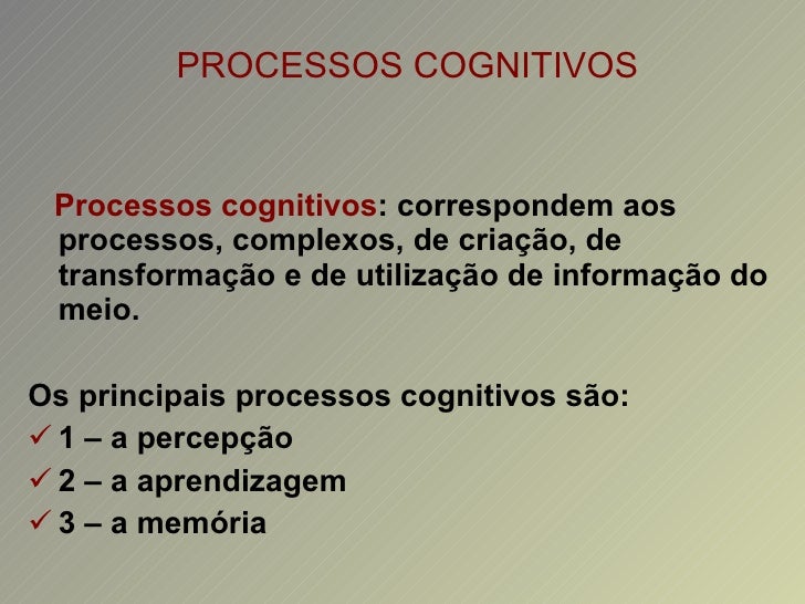 Um exemplo muito evidente de processo cognitivo superior é o aprendizado, pois é a combinação de processos como a atenção, memória e pensamento. Em seguida, definimos todos os processos cognitivos básicos de acordo com a psicologia. 1. Percepção. Trata-se de um processo mental no qual organizamos todas as informações provenientes do.